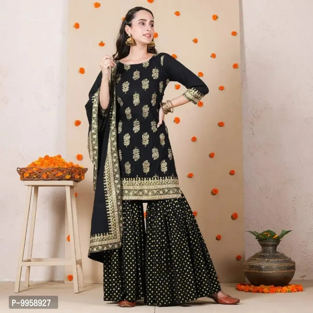 ★Fabric :: Rayon ★Colour :: Black ★Type :: Kurta, Bottom and Dupatta Set ★Style :: Embellished ★Design Type :: Short Kurti ★Occasion :: Casual ★Pack Of :: Single ★Kurta Length :: Knee Length ★Sleeve Length :: 3/4 Sleeve