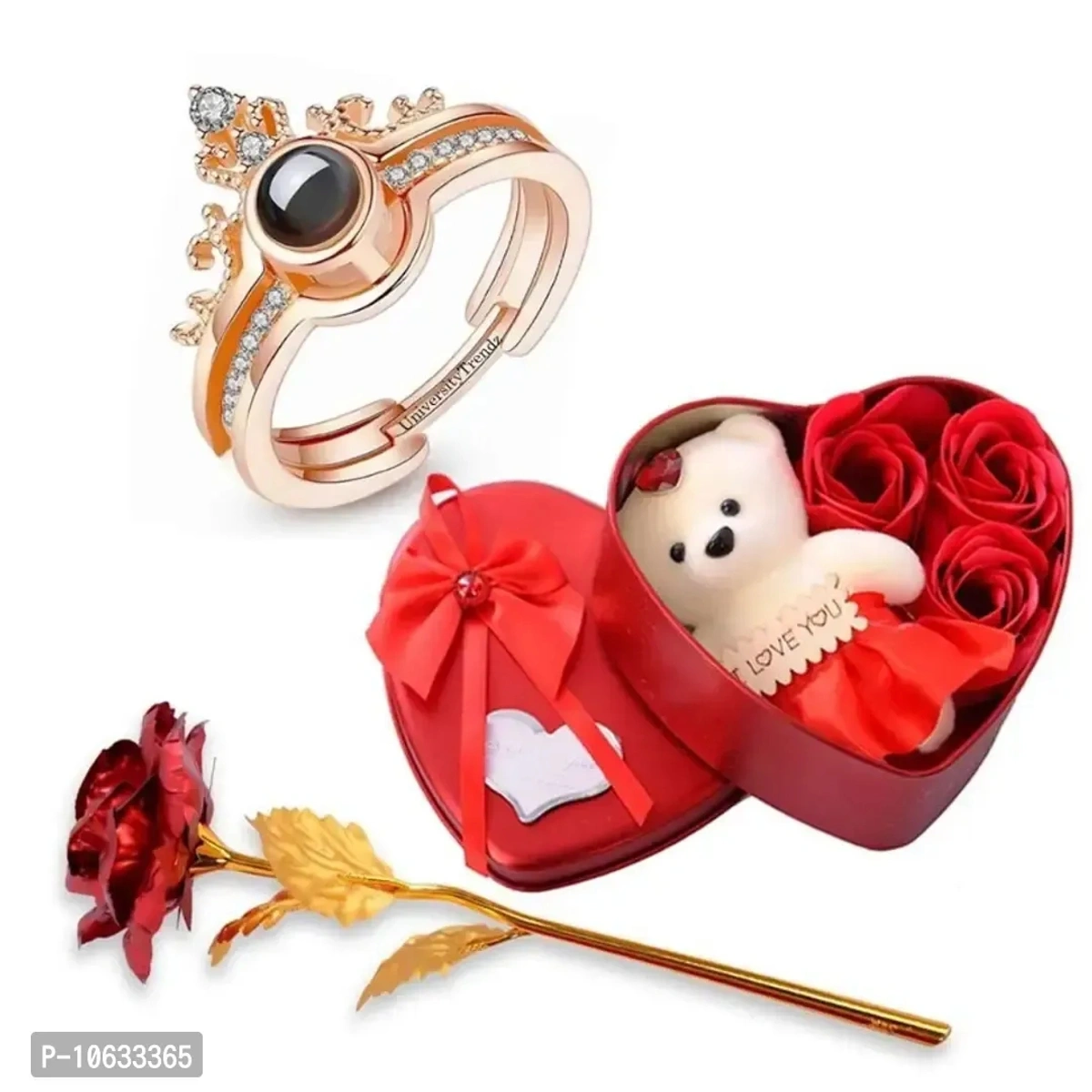 Valentines Gift Combo Valentine Rose Gold Crown Ring with Artificial Red Rose Soft Teddy Bear with Flower Box for Girlfriend, Wife, Lovers Romantic Gift for Valentine Day