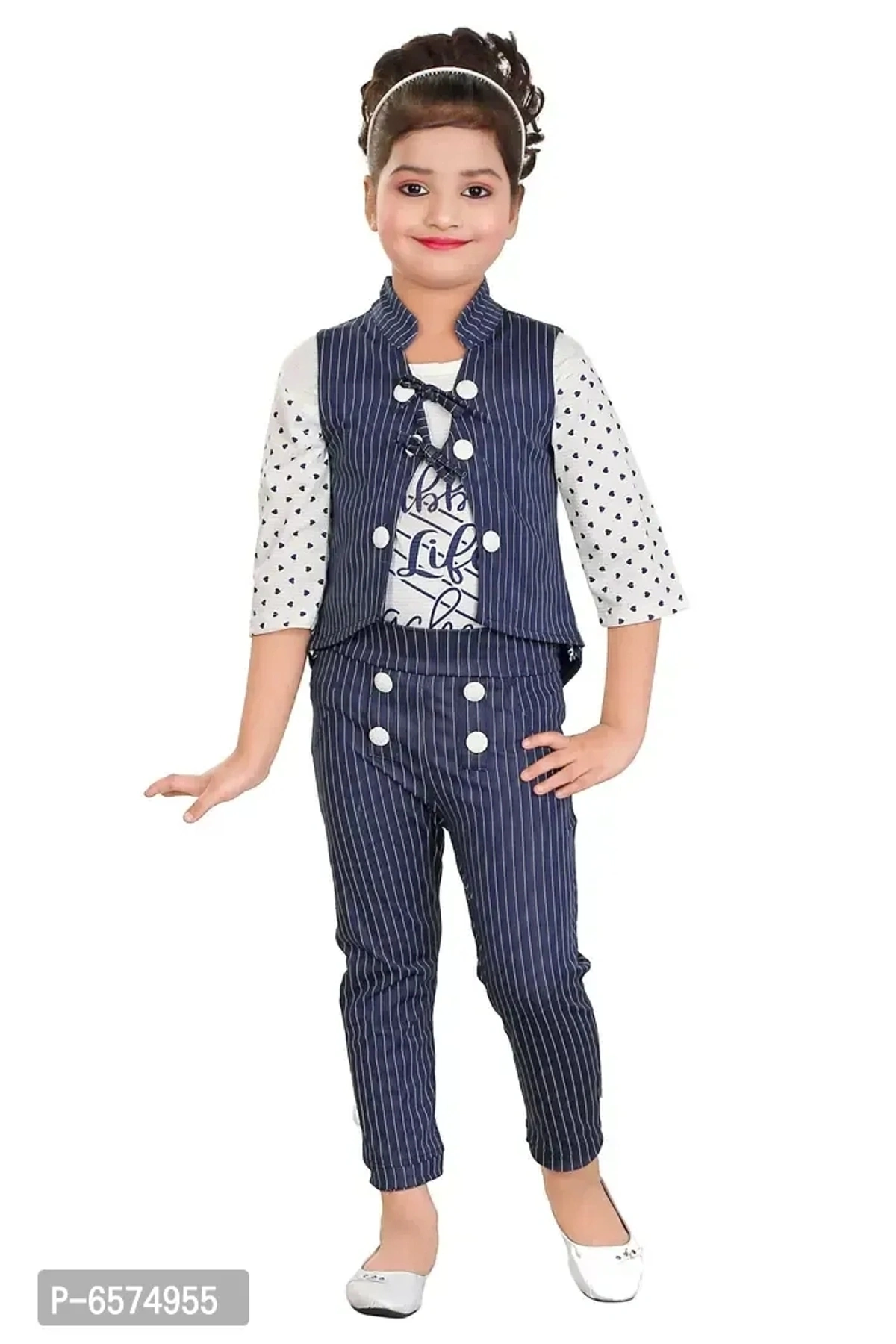 Elegant Blue Polyester Spandex Self Pattern Top with Pant And Jacket Set For Girls