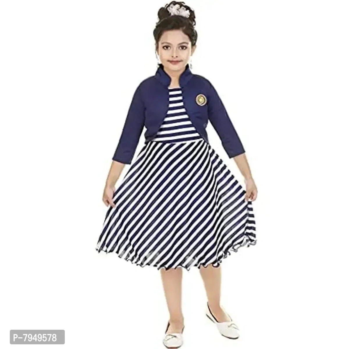 Fariha Fashions Girl's A-Line Knee Length Dress (BLUE_WHITE_STRIPED_Blue & White_5-6 Years)