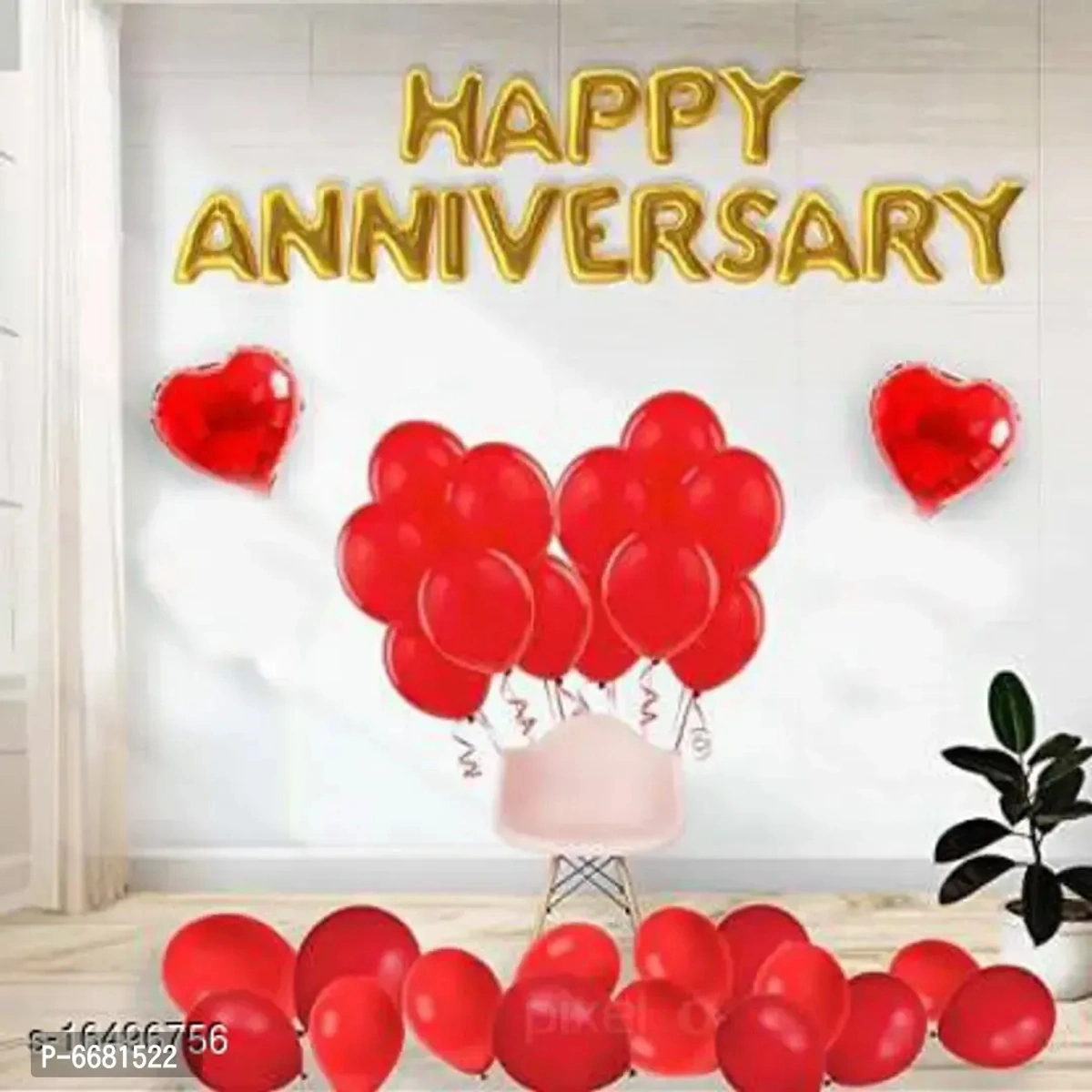 Happy Anniversary (16 Gold Foil Letters) and 2 Red Heart Foil Balloons (10Inch) and 30 Metallic Balloons (Red)
