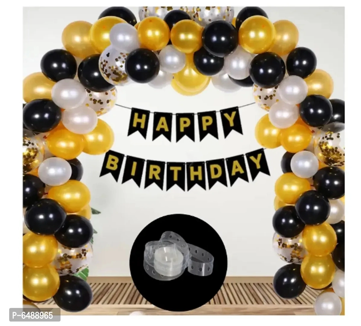 Combo In Which You Will Get 10 Golden, 10 Silver 10 Golden Metallic Balloons + Happy Birthday Banner (Black Colour) + 1 Balloon Arc Tape This Super Trendy Decoration Combo Is Specially Designed For Your Loved,