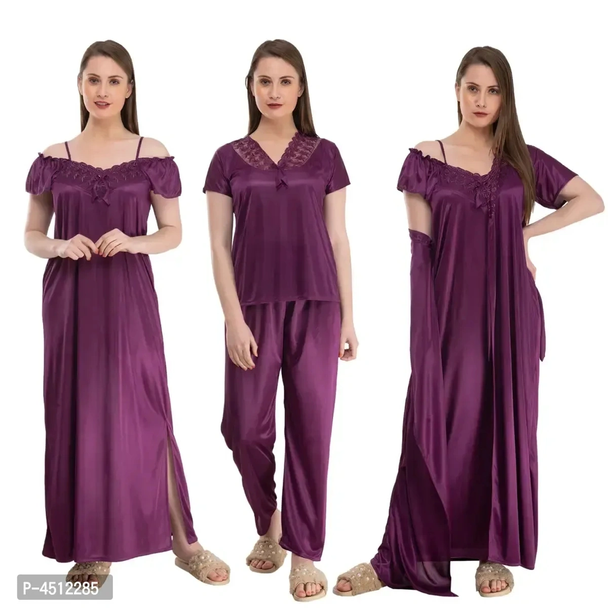 Purple Trendy Women's Satin 4Pcs Night Wear Set