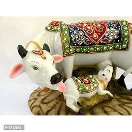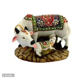 bull; USE : This Decorative Murti can be used as Pooja Mandir Interior Decoration Accessories / Table Decor Items or Showcase Decoration .bull; BENEFICIAL IMPACT : As per VASTU Methology Religious Spritual Idols Showpieces Placed in North East Direction of Drawing / Living Pooja Room , brings Wealth , Health , Peace Happiness Among The Home Members Like Mother , Father , Husband , Wife , Brother , Sister , Son , Daughter Friend.bull; GIFT FOR : It is a Best Gift for new born babies and mother, Marriage Anniversary , Parents , Mothers day , Wedding Return Gift , Birthday , House warming , Office / Shop.bull; Inaugration , Festive occasions - Like Diwali ,Raksha Bandhan , Grah pravesh and Corporate Gifts Care Instruction - Don't wash, use dry cotton cloth to remove dirt.Saudeep India Presents You a wide range of showpieces:Featuring a cow with her baby on a circular stand in multicolor. Made out of Polyresin to give this showpiece an amazing look.Kamadhenu or Kamaduha(the cow of plenty):The name Kamadhenu came from the Sanskrit root, Kamaduha, which literally means, the cow of plenty and the one through whom all desires are fulfilled. It is believed that each part of the kamdhenu cow embodies a particular deity is worshipped as the divine wish-fulfilling cow goddess, according to Hindu mythology.Divine Cow:This divine cow, which lives in swargalok (heaven), emerged from the ocean of milk (kshira-sagar) at the time of samudra-manthan (the great churning of the ocean by the gods (suras) and demons (asuras). It was presented to the seven sages by the Gods, and in course of time came into the possession of Sage Vasishta. It is believed that as Kalpa-vriksha, (heavenly tree) Kamadhenu, in the same way, fulfills the desires of those who approach it with Pragya and devotion Kamadhenu is also known as Surabhi, is a divine goddess described in Hinduism as the Cow of Wish. Kamadhenu is a cow of plenty who fulfills all the wish and is portrayed as the mother of all cows.Fulfills all the wishes of the worshipper:Kamadhneu is also known as a Gayatri and worshipped as a heavenly cow. It is also known as Nanda, Sunanda, Surabhi, Susheela and Sumana. Kamdhenu Cow fulfills all the wishes of the worshipper. It gives health, wealth, happiness, and growth in life. Kamdhenu is the mother of all cattle. This cow lives in heaven and emerged from the ocean of milk (Khirsagar) during Samudra Manthan.?
