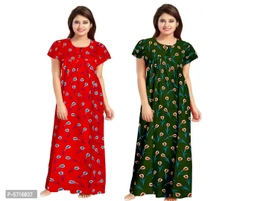 Stylish Cotton Round Neck Short Sleeves Red and Green Floral Print Night Gown For Women ( Pack Of 2 )