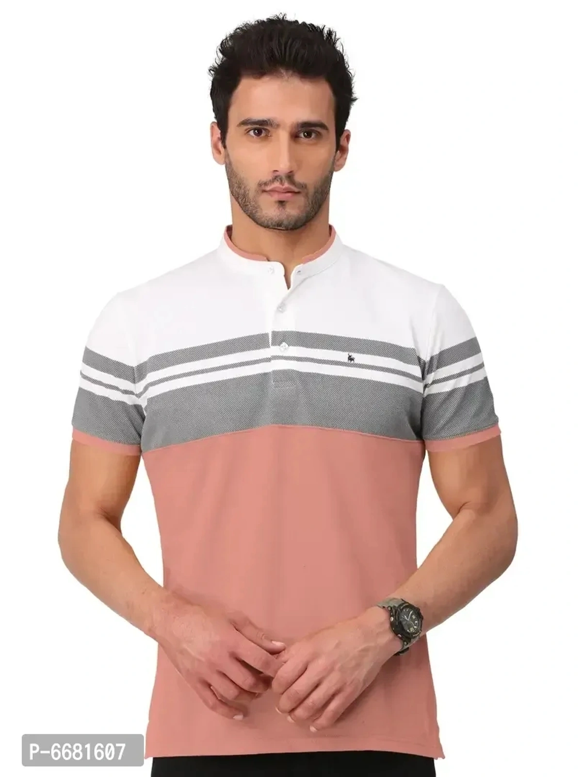 Stylish Cotton Straight Collar Chinese Collar Neck Color Block T-Shirt For Men