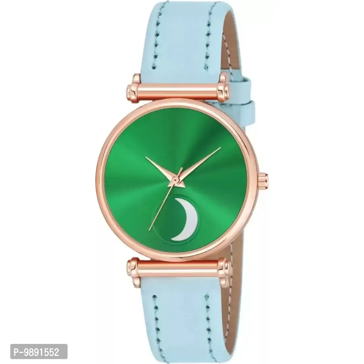 Stylish Green Moon Dial Leather Strap Watch For Girls