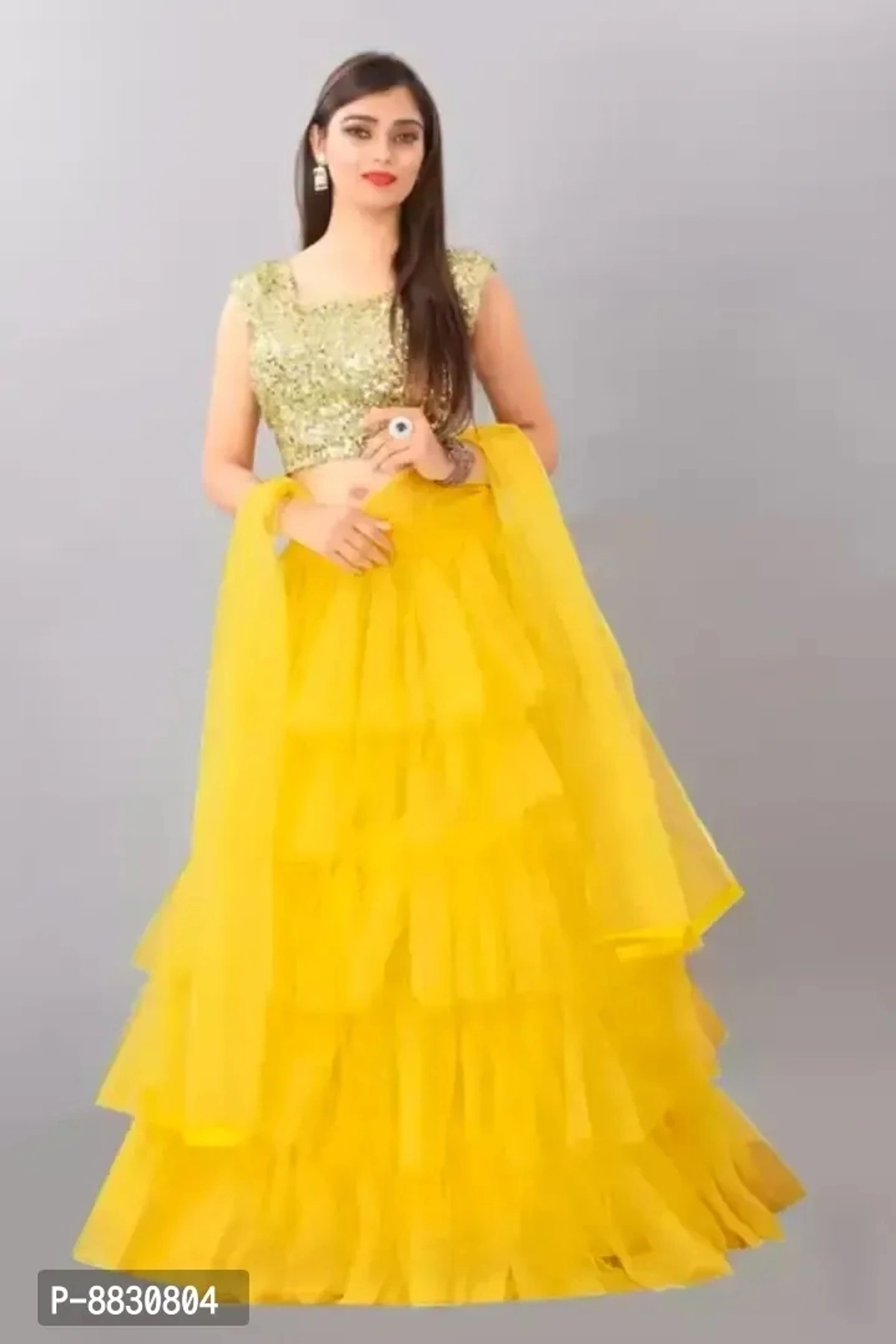 Topwear Fabric: Velvet Bottomwear Fabric: Net Dupatta Fabric: Net Set type: Choli And Dupatta Top Print or Pattern Type: Embellished Bottom Print or Pattern Type: Ruffle Dupatta Print or Pattern Type: Solid Sizes: Semi Stitched (Lehenga Waist Size: 44 in, Lehenga Length Size: 44 in, Duppatta Length Size: 2 in) Un Stitched (Lehenga Waist Size: 44 m, Lehenga Length Size: 44 m, Duppatta Length Size: 2 m) Free Size (Lehenga Waist Size: 44 in, Lehenga Length Size: 44 in, Duppatta Length Size: 2 in)