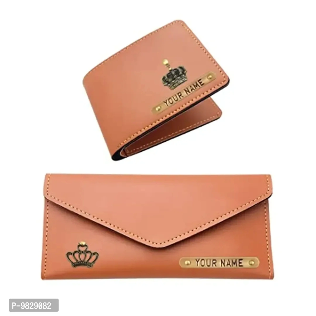 The Bling Stores Personalized Genuine PU Leather Women Clutch and Wallet Combo for Couple / Name Crafted/ 1 Charms /Couple Combo Set of Women Clutch and Wallet ( Tan Brown )