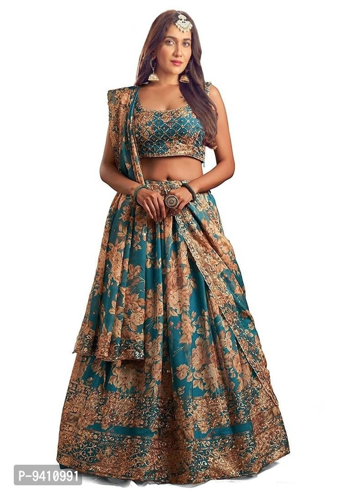 Trendy Teal Blue Georgette Lehenga Choli With Dupatta Set For Women