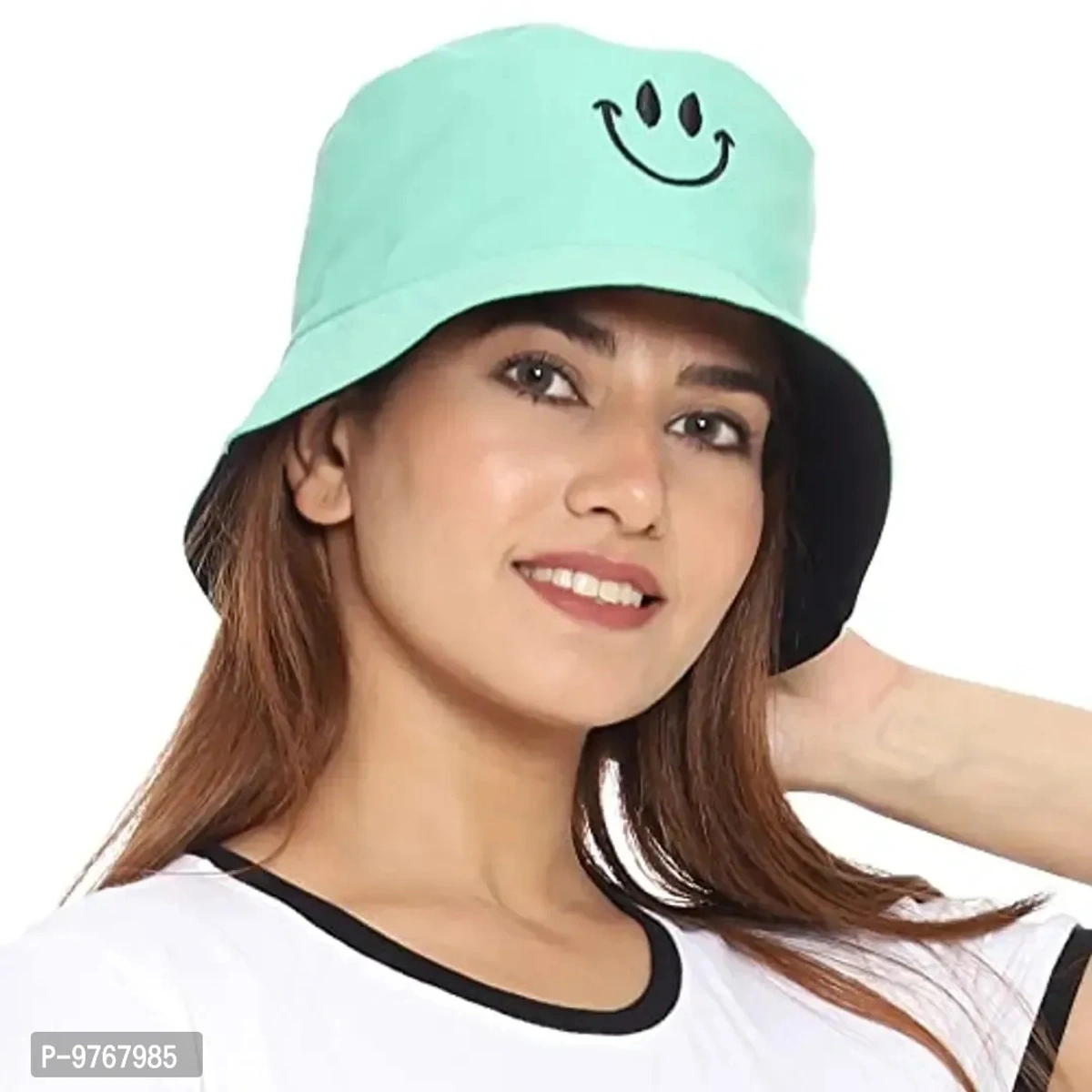 Unisex Smiley Face Bucket Hat Double-Sided Embroidery Cotton Reversible Hats for women and men (Aqua Green & Black)