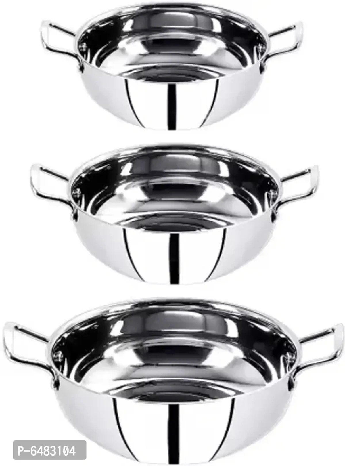 Useful Stainless Steel Deep Frying 22 Gauge Heavy Bottom Induction Kadai Cookware Utensils Set with Handle-3 Pieces