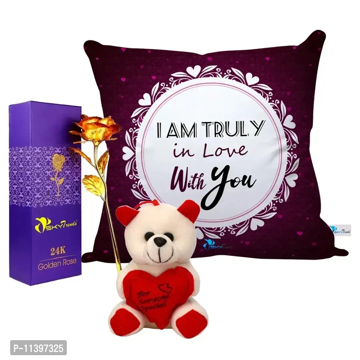 Valentine Gift Combo Printed Cushion with Filler, Artificial Gold Rose and Cute Little Teddy