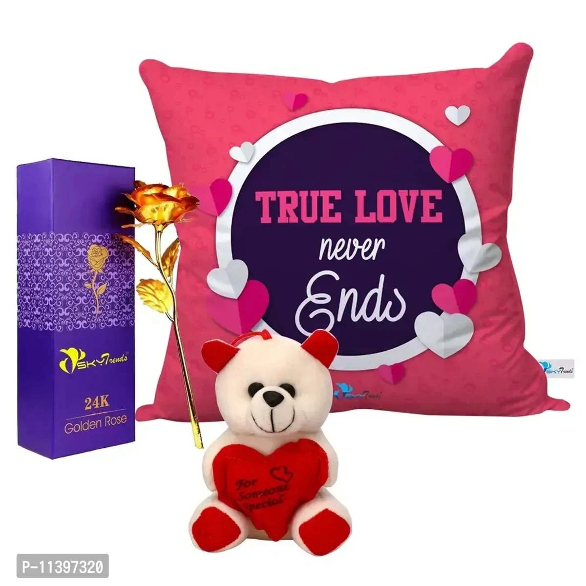 Valentine Gift Combo Printed Cushion with Filler, Artificial Gold Rose and Cute Little Teddy