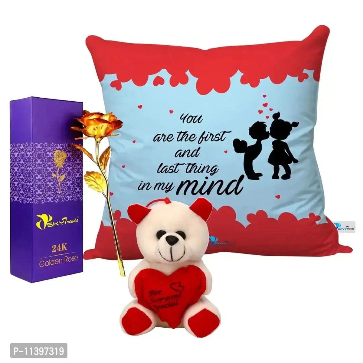 Valentine Gift Combo Printed Cushion with Filler, Artificial Gold Rose and Cute Little Teddy