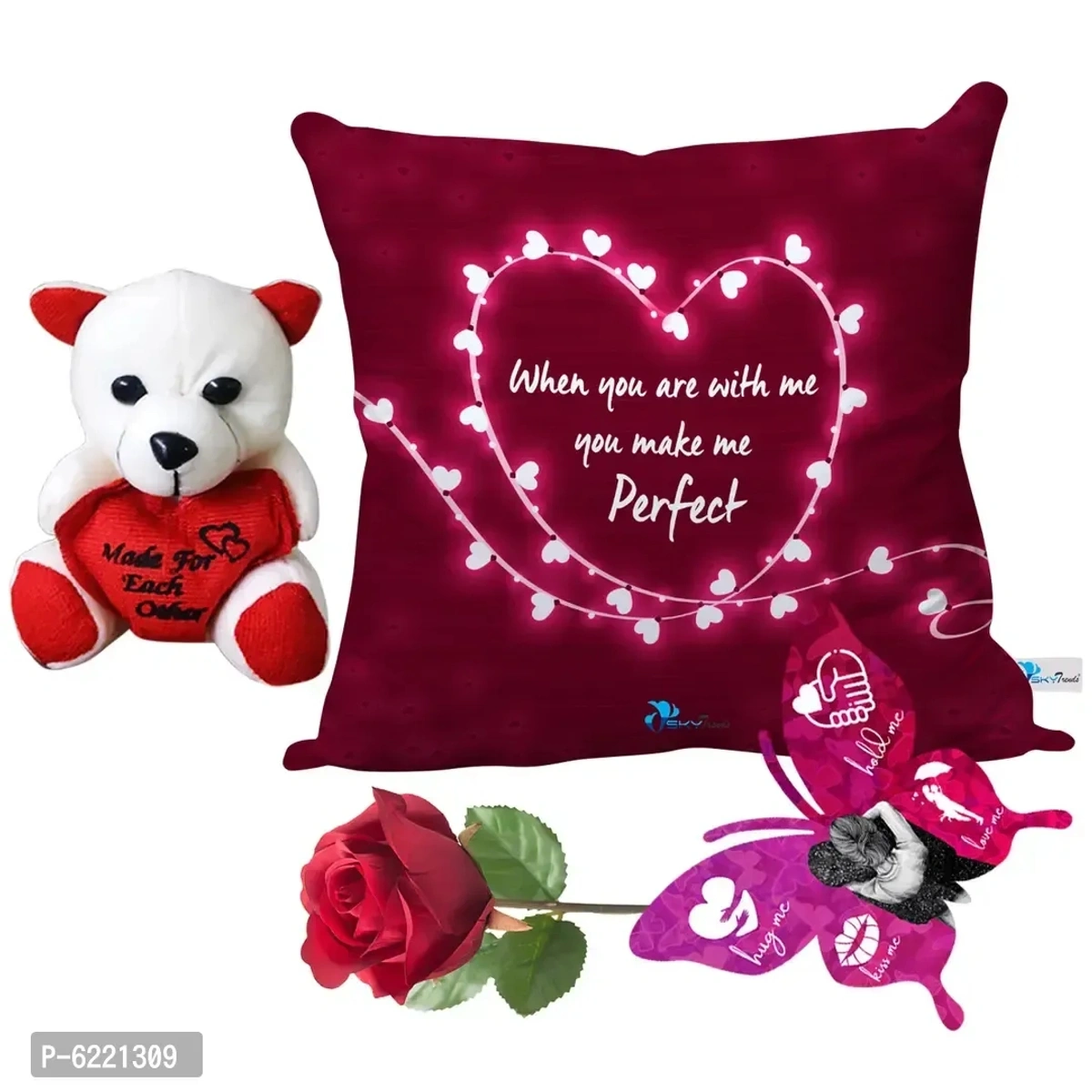 Valentine Gift Combo Printed Cushion with Filler, Cute Little Teddy with Butterfly Shaped Greeting Card and Artificial Rose-044