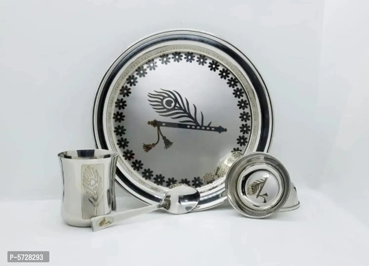 WELCOME 5 Pcs Ladoo Gopal Laser Print Mirror Finish Stainless Steel Baby Lunch Dinner Set for Kids - 1 Plate, 2 Curry Bowl, 1 Glass, 1 Spoon (for Both Baby Boys and Girls)