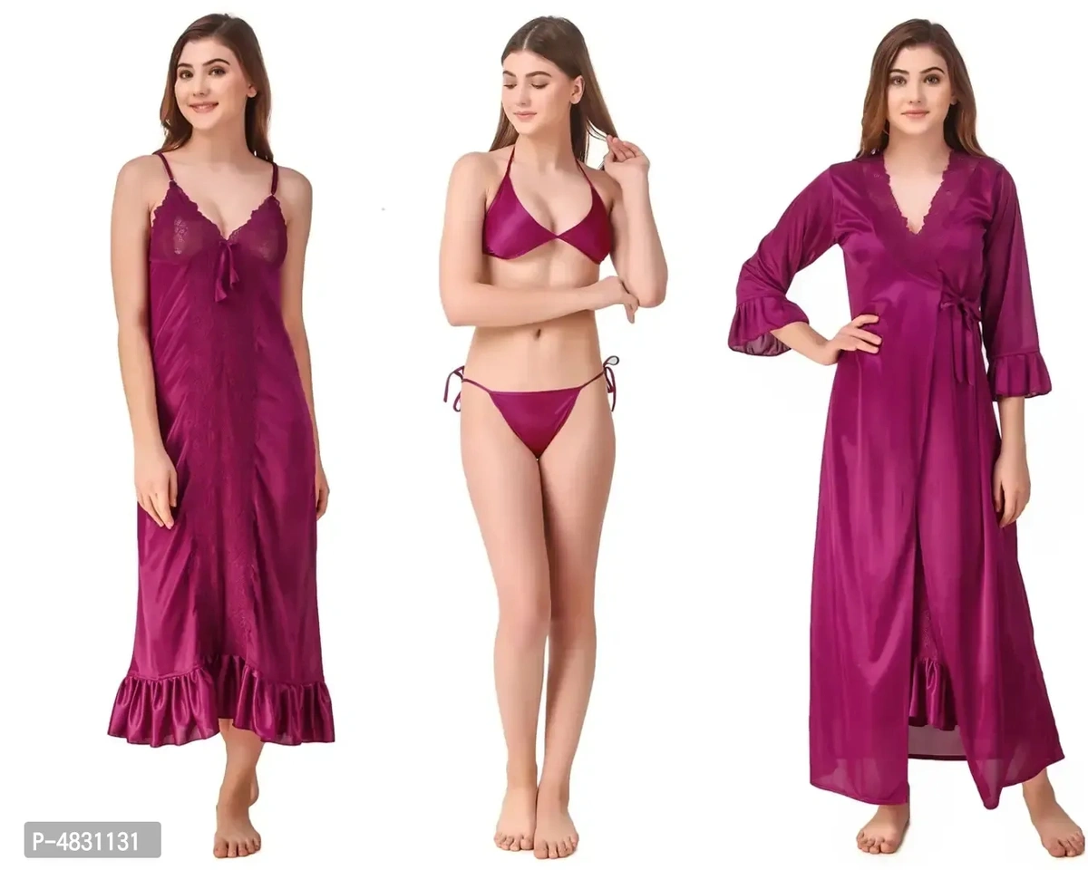 Women Satin Nightwear Set of 4 Pcs (Nighty, Wrap Gown, Lingerie Set)