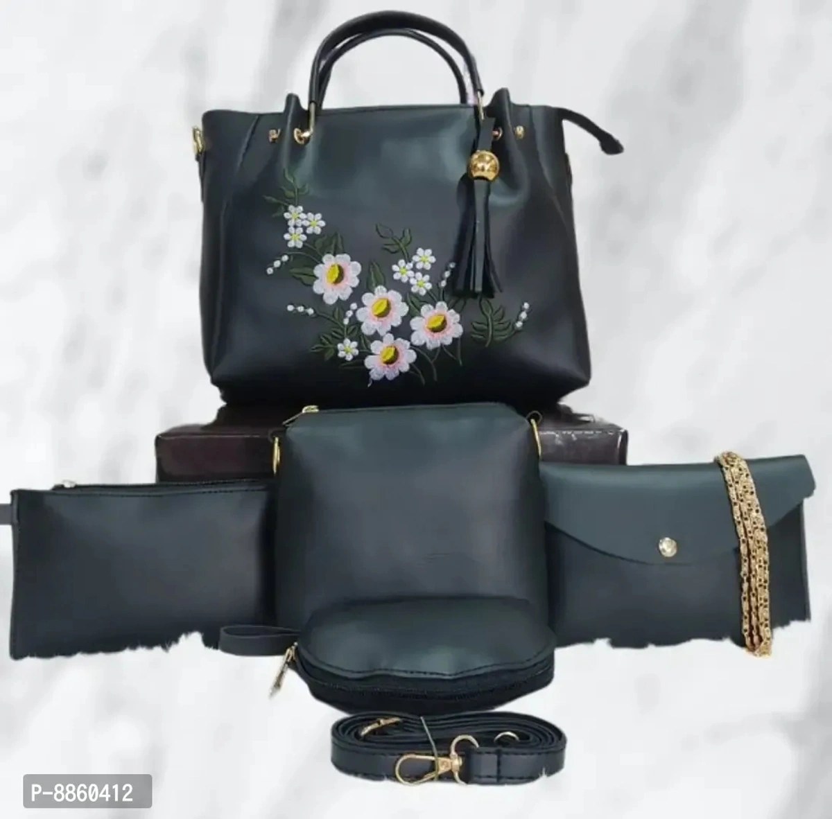 Title: Stylish PU Combo of Handbag With Pouch Weight -750g Size Height-10 Inch Lenght-11 Inch Width-4 Inch Material: PU Description -Handbag Set Of 5 1-Handbag With Metal Handel with Single Compartments 1 Back Pocket and 1 Inside Pocket with Adjustable Long Belt 2-Sling Bag 3-Sling with chain Handel 4-coin pouch 5-D Pouch
