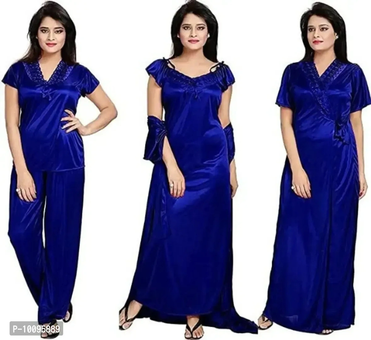 Womens solid Satin nighty set of 4 piece (Blue)